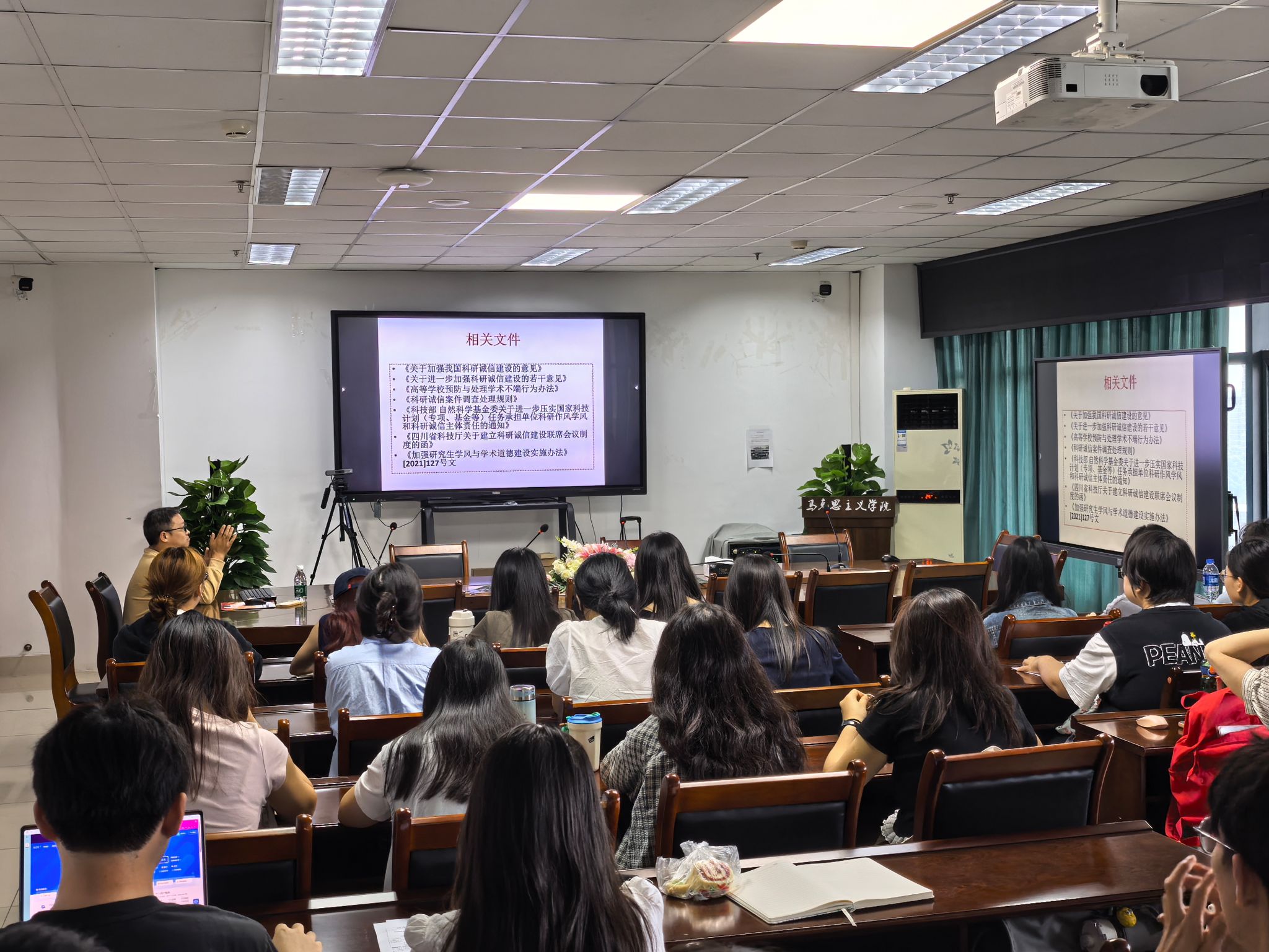 在科学道德与学风建设专题教育中,研究生教学部主任熊小果以国家科研诚信与学术道德相关政策文件为切入点,介绍了学术不端行为的界定,结合典型案例分析不当科研行为的表现与成因,并提出防范措施。他呼吁同学们自觉抵制学术失范行为,将规范意识内化于心、外化于行。