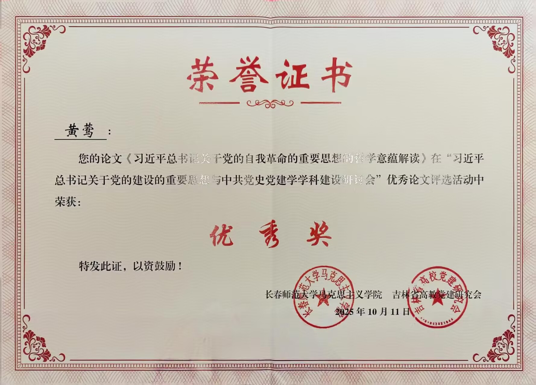 为深入学习贯彻习近平新时代中国特色社会主义思想,全面落实党的二十大精神,进一步加强对党的历史与新时代党的建设相关问题的研究与探讨,促进相关学术研究工作的深入开展,2025年10月11日,习近平总书记关于党的建设的重要思想与中共党史党建学学科建设研讨会在吉林省长春市召开。本次研讨会由长春师范大学马克思主义学院、吉林大学中共党史党建研究院、吉林大学国家革命文物协同研究中心、吉林省东北抗联研究会、吉林省中国共产党党史和文献研究会、吉林省高校党建研究会联合主办。我院研究生黄莺提交的论文《习近平总书记关于党的自我革命的重要思想的哲学意蕴解读》成功入选并获得优秀奖。
