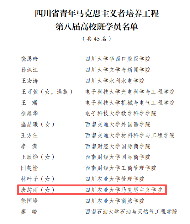 日前,共青团四川省委、四川省教育厅发布《关于确定四川省青年马克思主义者培养工程第八届高校班入选学员的通知》,经学校推报、资格审查、综合评审等程序,确定了本届四川省“青马工程”高校班学员共45人,我院马克思主义理论专业2025级硕士研究生唐芯雨入选成为四川省青年马克思主义者培养工程第八届高校班正式学员。