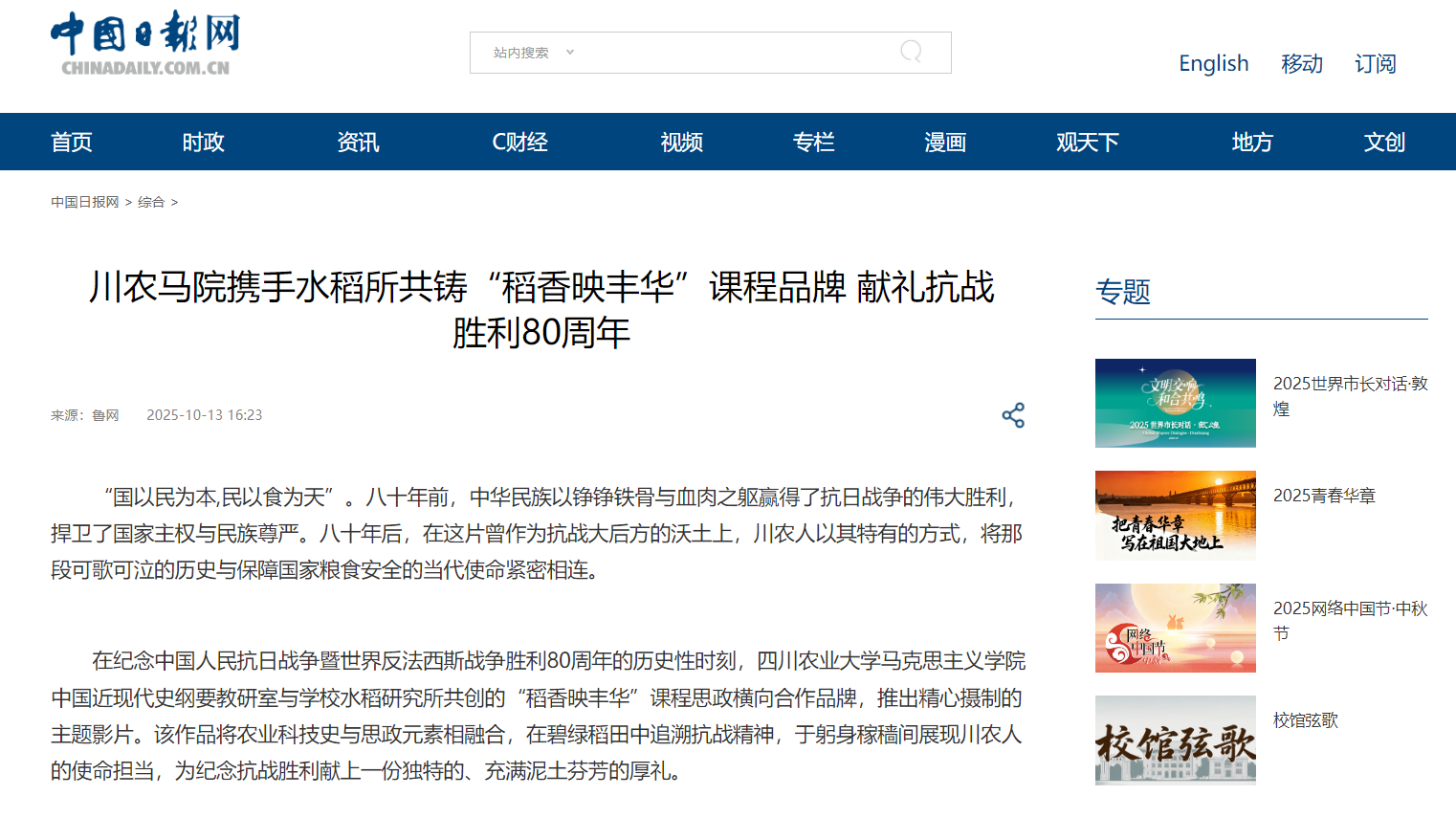 在纪念中国人民抗日战争暨世界反法西斯战争胜利80周年的历史性时刻,四川农业大学马克思主义学院中国近现代史纲要教研室与学校水稻研究所共创的“稻香映丰华”课程思政横向合作品牌,推出精心摄制的主题影片。该作品将农业科技史与思政元素相融合,在碧绿稻田中追溯抗战精神,于躬身稼穑间展现川农人的使命担当,为纪念抗战胜利献上一份独特的、充满泥土芬芳的厚礼。