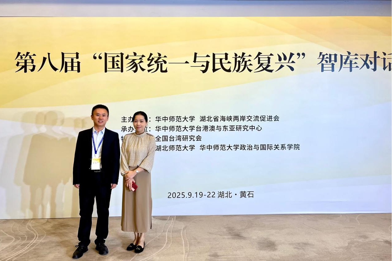 2025年9月19日-22日,第八届“国家统一与民族复兴”高端智库研讨会在湖北黄石举办,会议由华中师范大学和湖北省海峡两岸交流促进会共同主办,全国台湾研究会特别支持,华中师范大学台港澳与东亚研究中心承办,湖北师范大学和华中师范大学政治与国际关系学院协办。海峡两岸暨港澳100余名专家、学者,围绕“同向把握历史大势 同心续写复兴华章”主题展开研讨。我院教师宫高杰与四川省台办林萍处长一同参会。