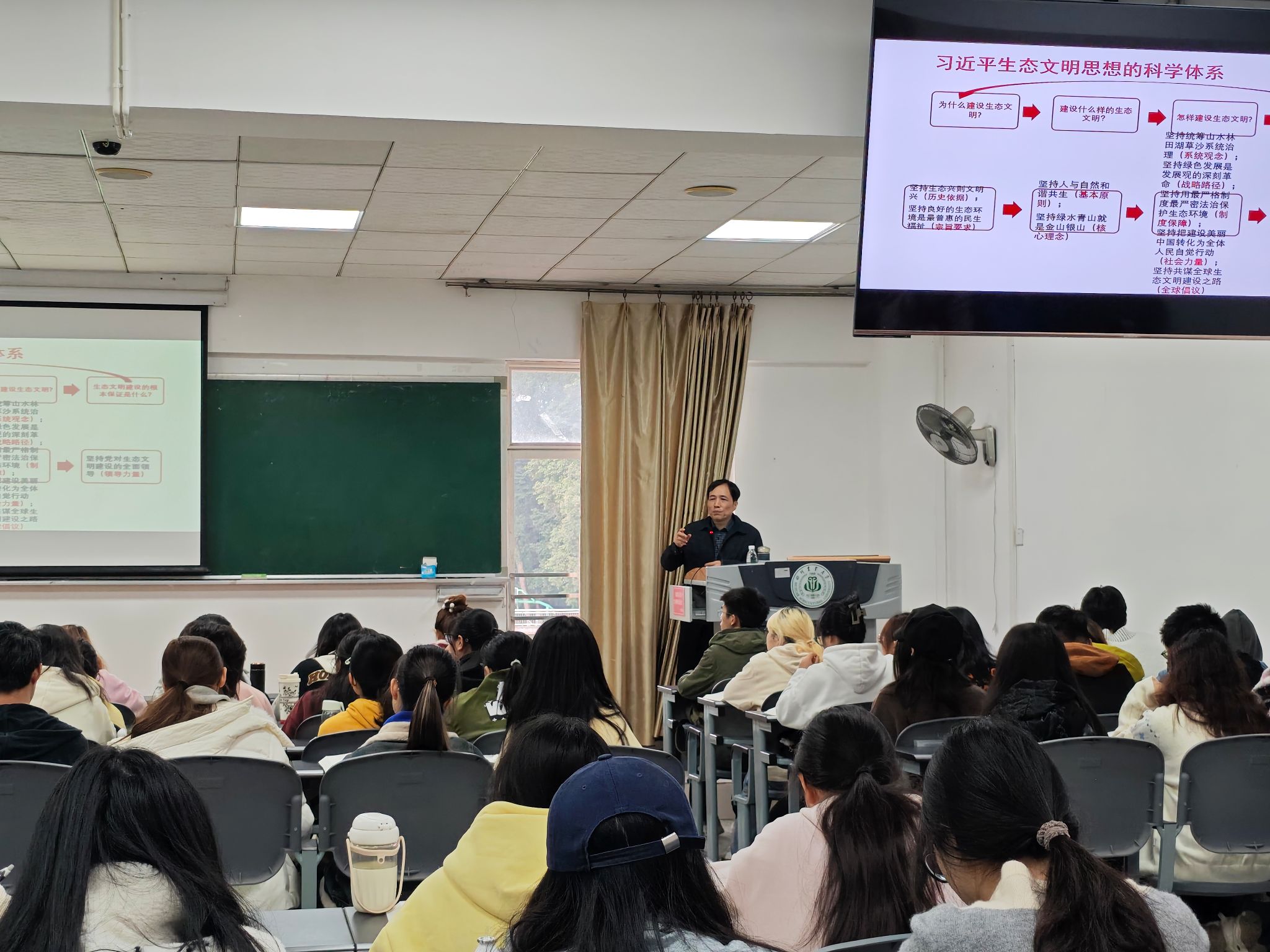 2025年11月4日上午,四川省社会科学院党委副书记、院长杨颖教授莅临四川农业大学马克思主义学院,以习近平生态文明思想为题,为会计学专业2024级学子讲授了一堂别开生面的专题思政课。课堂座无虚席,互动热烈。