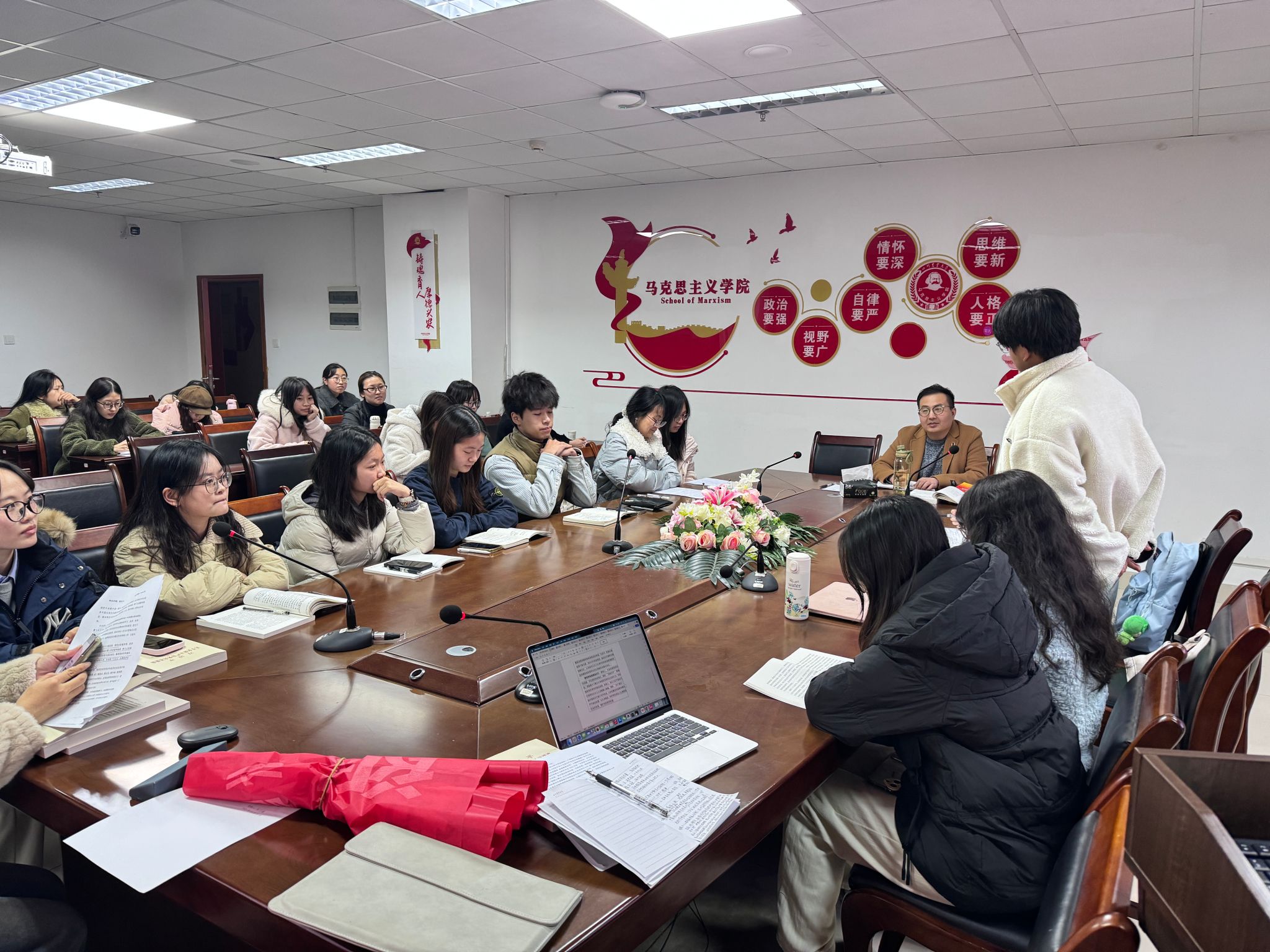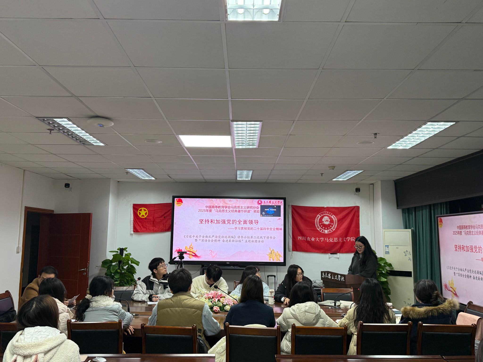 11月26日,中国高等教育学会马克思主义研究分会2025年“马克思主义经典著作研读”资助计划——四川农业大学《习近平关于全面从严治党论述摘编》读书小组在7教1607举办了第二次线下读书活动。该活动以“坚持和加强党的全面领导——学习贯彻党的二十届四中全会精神”为主题,邀请马克思主义学院张学维、张旭两位老师作为主讲嘉宾,读书小组成员、学校青马班学员、学院2025级研究生等40余位同学参加。读书小组组长孙媛主持活动。