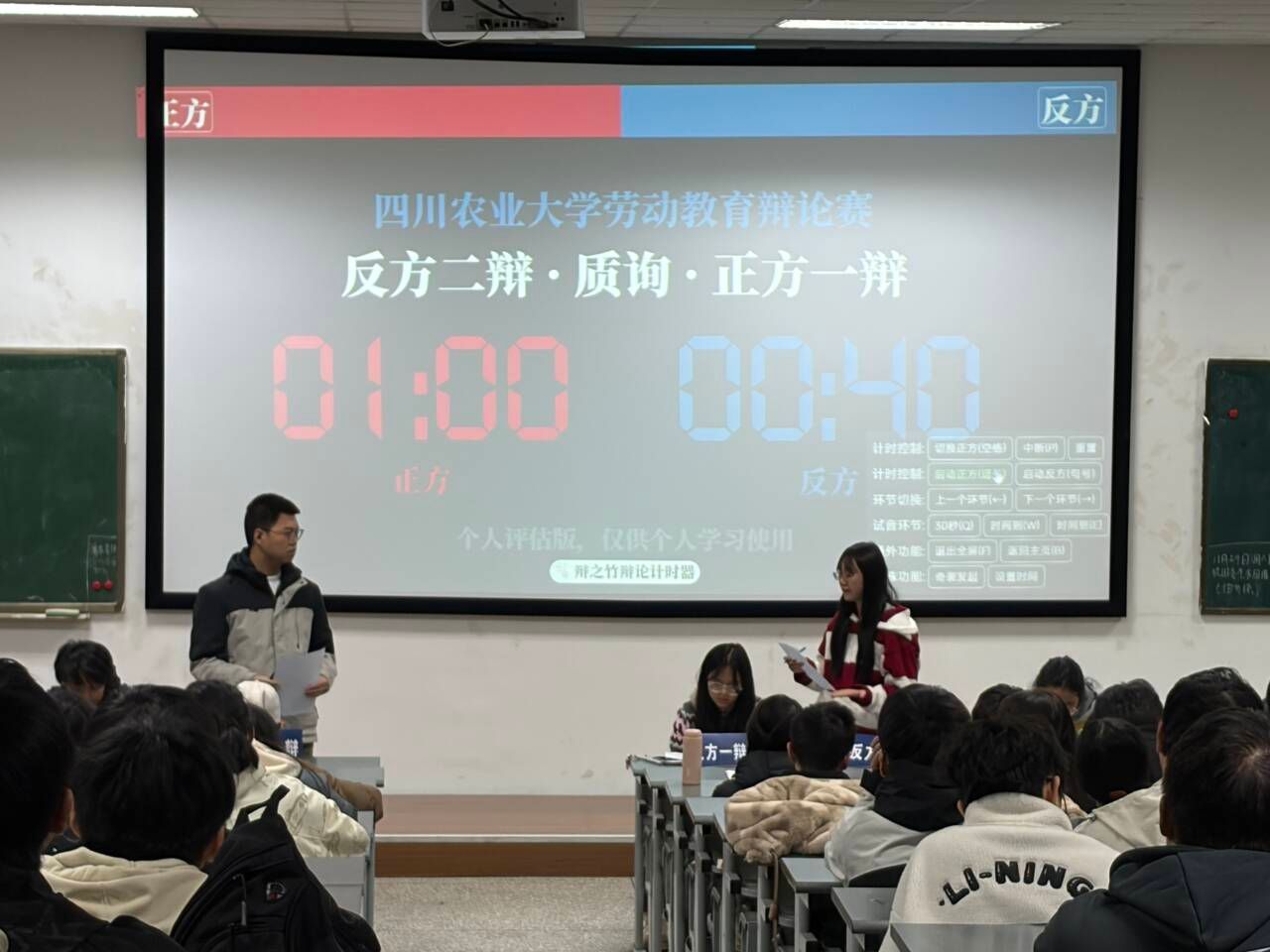 为深化新时代劳动教育课程改革,打破传统劳动教育单向讲授模式,澄清学生对劳动的模糊认识、加深劳动认知,让课堂更具趣味性、参与性,增强劳动教育课程的吸引力与教学实效。11月26日晚,任课教师李晓辉首次以“小班辩论赛”形式组织课堂教学,来自环境学院相关专业的学生围绕“劳动的核心意义是创造物质财富还是实现自我价值”“劳动教育的重点是技能培养还是劳动精神塑造”“稳定型劳动与奋斗型劳动哪一种更有价值”“躺平是当代人的毒药还是解药”“为生存劳动与为热爱劳动哪一种更能让人长期投入”辩题展开交锋,为传统劳动教育课堂注入新活力。