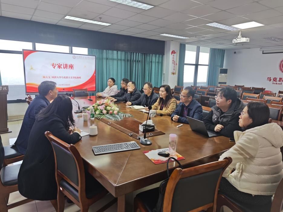 为深化思政课改革创新,提升教师队伍教学科研水平,科学谋划学院未来发展,2025年11月28日下午,我院特邀同济大学长聘教授、“国家级人才”教学名师、教育部“思想道德与法治”分教学指导委员会副主任委员陈大文教授莅临我院指导。