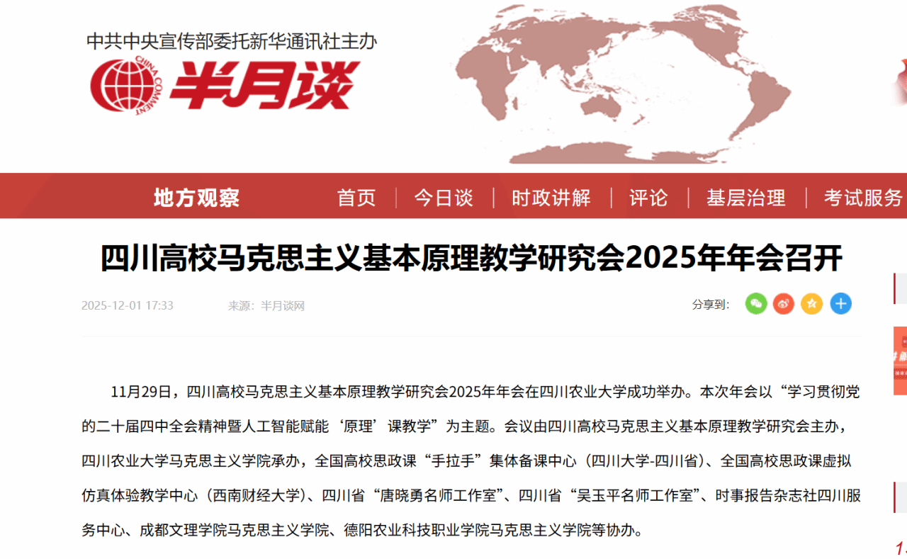 11月29日,四川高校马克思主义基本原理教学研究会2025年年会在四川农业大学成功举办。本次年会以“学习贯彻党的二十届四中全会精神暨人工智能赋能‘原理’课教学”为主题。会议由四川高校马克思主义基本原理教学研究会主办,四川农业大学马克思主义学院承办,全国高校思政课“手拉手”集体备课中心(四川大学-四川省)、全国高校思政课虚拟仿真体验教学中心(西南财经大学)、四川省“唐晓勇名师工作室”、四川省“吴玉平名师工作室”、时事报告杂志社四川服务中心、成都文理学院马克思主义学院、德阳农业科技职业学院马克思主义学院等协办。