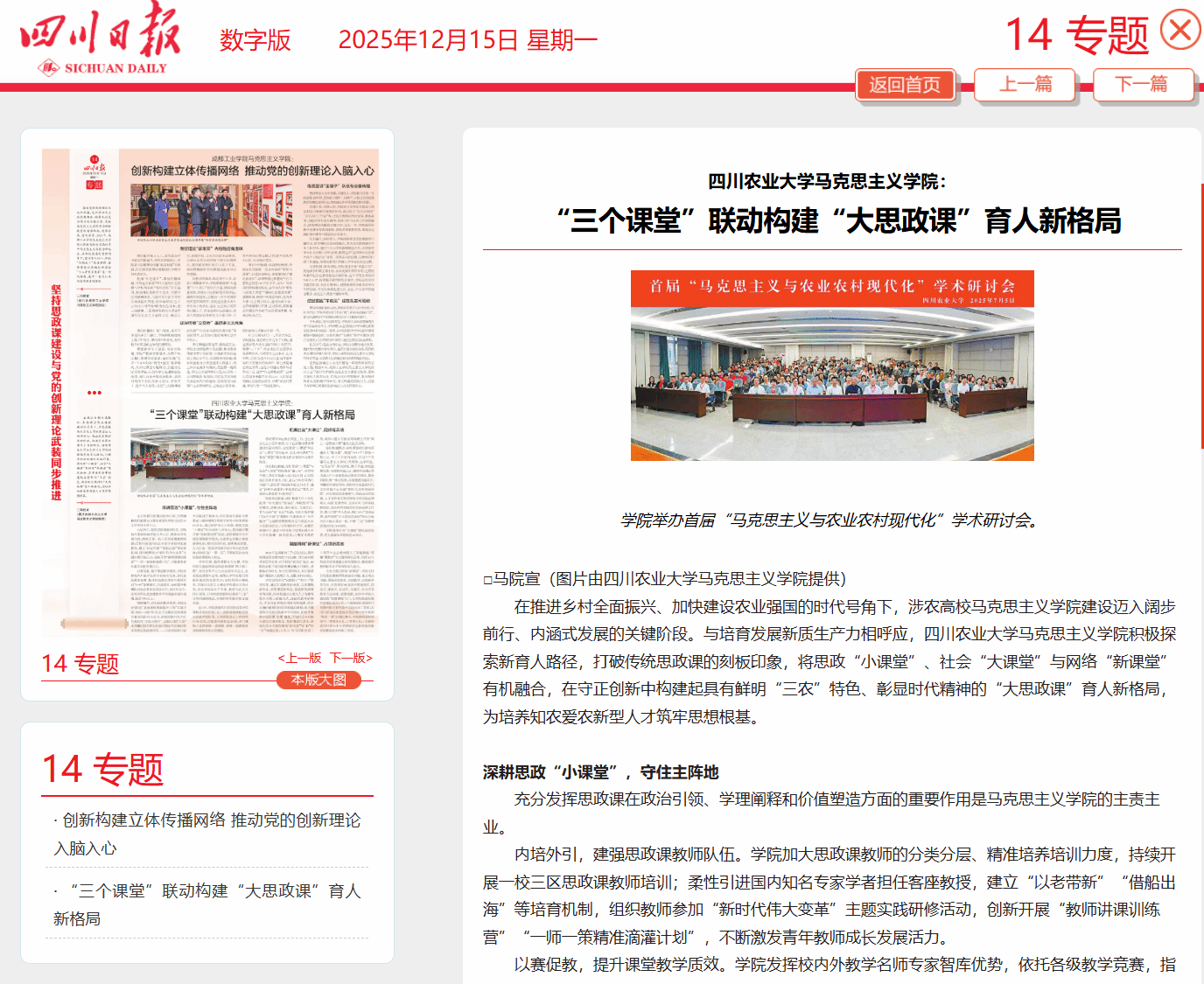 在推进乡村全面振兴、加快建设农业强国的时代号角下,涉农高校马克思主义学院建设迈入阔步前行、内涵式发展的关键阶段。与培育发展新质生产力相呼应,四川农业大学马克思主义学院积极探索新育人路径,打破传统思政课的刻板印象,将思政“小课堂”、社会“大课堂”与网络“新课堂”有机融合,在守正创新中构建起具有鲜明“三农”特色、彰显时代精神的“大思政课”育人新格局,为培养知农爱农新型人才筑牢思想根基。