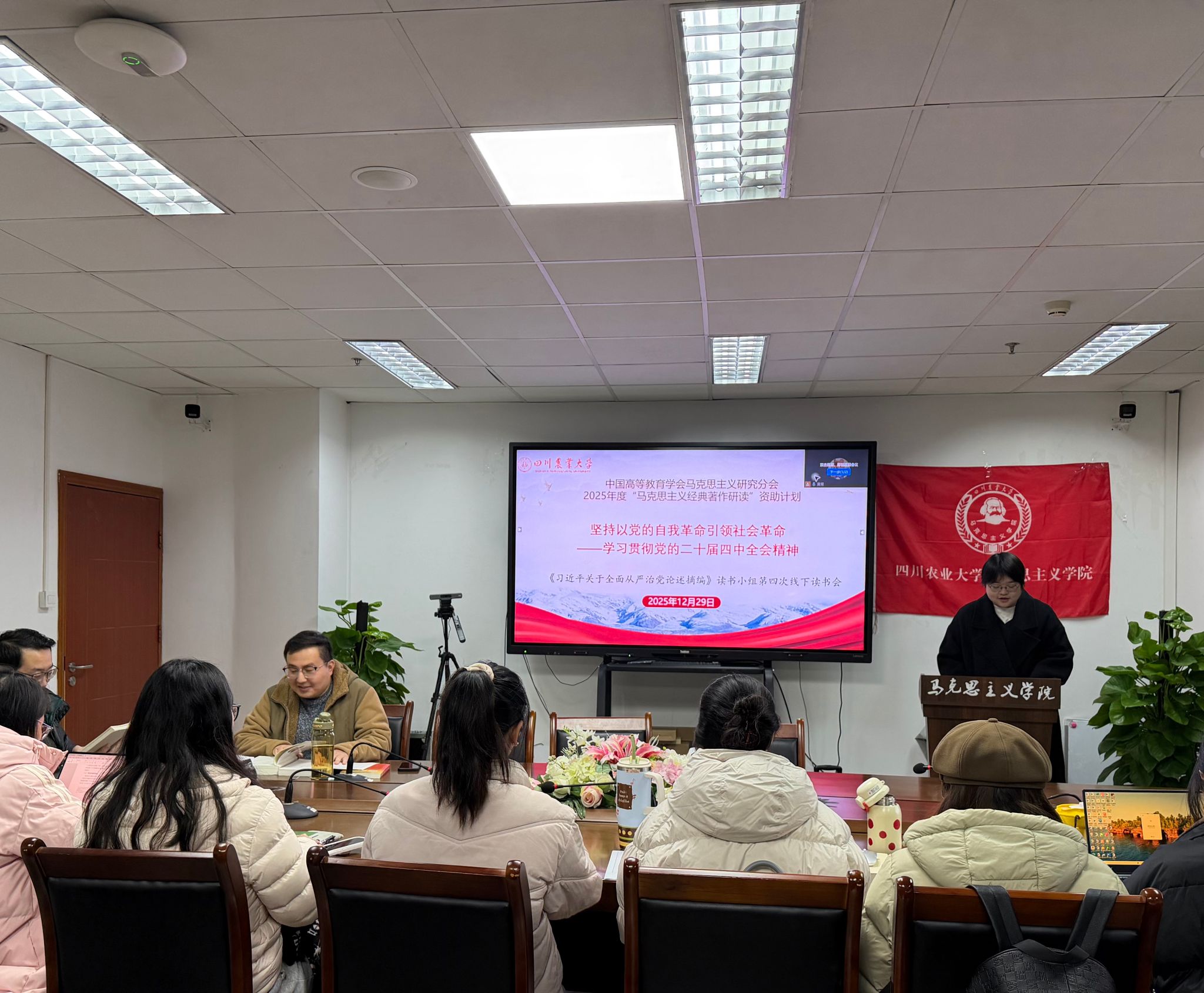 12月29日,中国高等教育学会马克思主义研究分会2025年“马克思主义经典著作研读”资助计划——四川农业大学《习近平关于全面从严治党论述摘编》读书小组在7教1607举办了第四次线下读书活动。该活动以“坚持以党的自我革命引领社会革命——学习贯彻党的二十届四中全会精神”为主题,邀请马克思主义学院李雕、张旭老师到场指导,读书小组全体成员和学院2025级研究生参加活动。读书小组成员严红君主持活动。