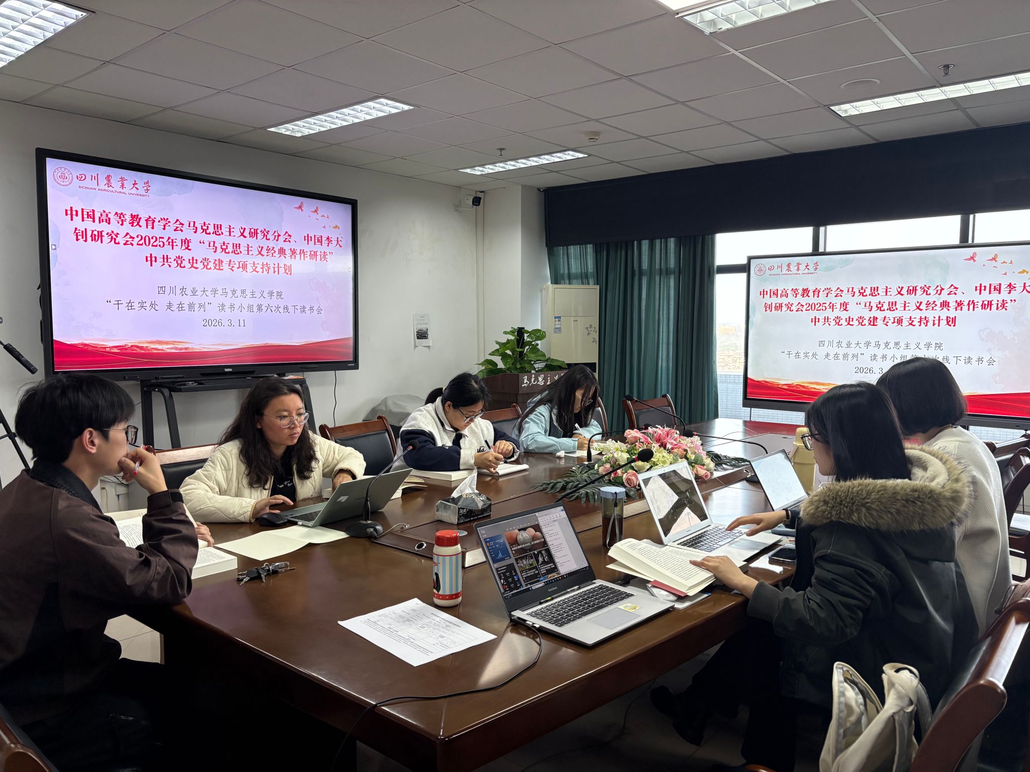 2026年3月11日,中国高等教育学会马克思主义研究分会、中国李大钊研究会2025年度“马克思主义经典著作研读”中共党史党建专项支持计划——四川农业大学“干在实处,走在前列”读书小组全体成员在七教1607举行第六次线下读书分享活动。本次活动围绕习近平总书记的著作《干在实处,走在前列——推进浙江新发展的思考与实践》第七章“加强党的执政能力建设,保持和发展党的先进性”展开深入讨论交流。