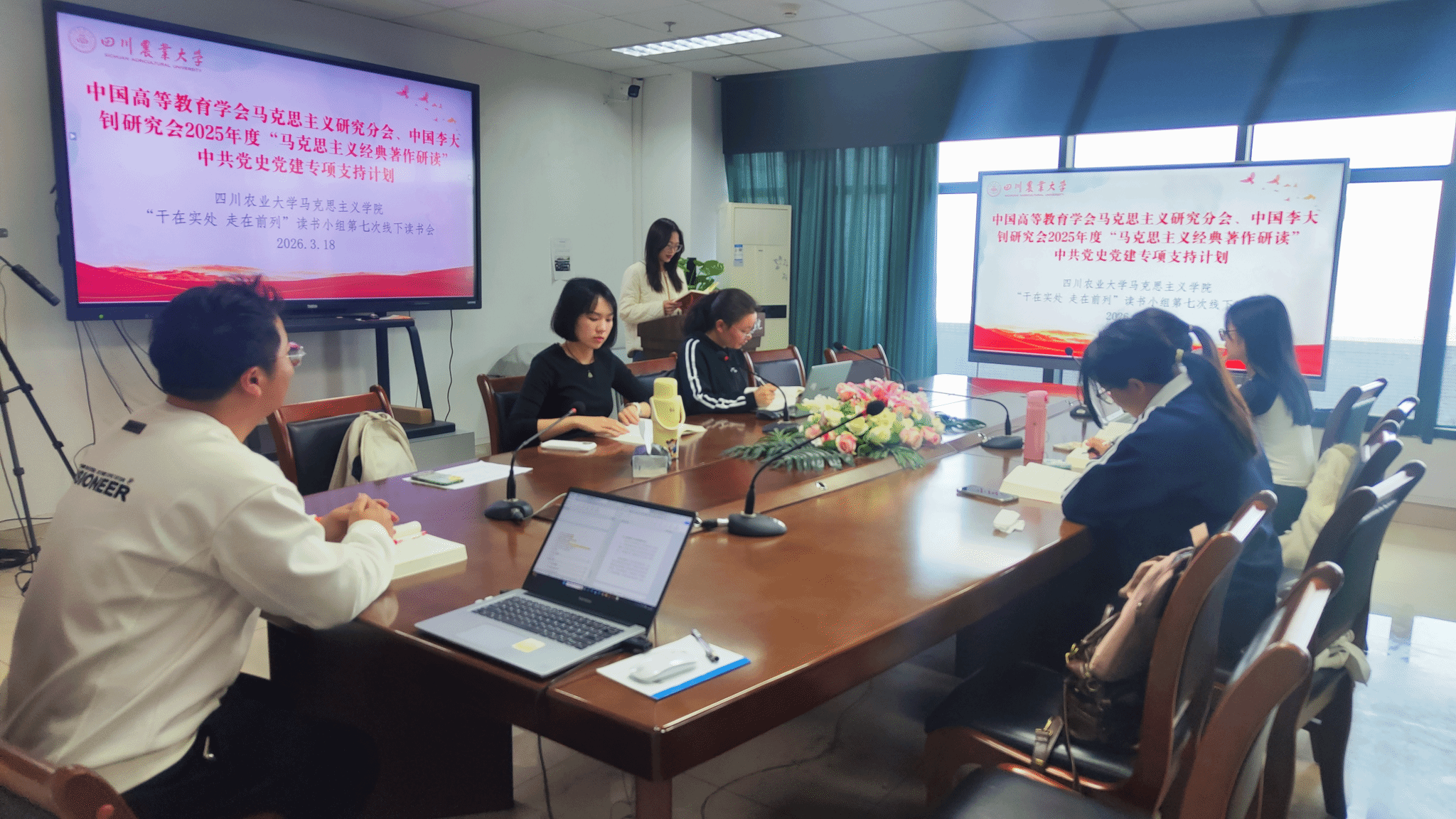 2026年3月18日,中国高等教育学会马克思主义研究分会、中国李大钊研究会2025年度“马克思主义经典著作研读”中共党史党建专项支持计划——四川农业大学“干在实处,走在前列”读书小组全体成员在七教1607举行第七次线下读书分享活动。本次活动聚焦习近平总书记著作《干在实处,走在前列——推进浙江新发展的思考与实践》第七章“发挥各地特色和优势,增强浙江综合竞争力”,小组成员就区域差异化发展、优势资源整合及综合竞争力提升等议题展开深入研讨,旨在通过经典研读深化对新时代发展实践的认知与思考。