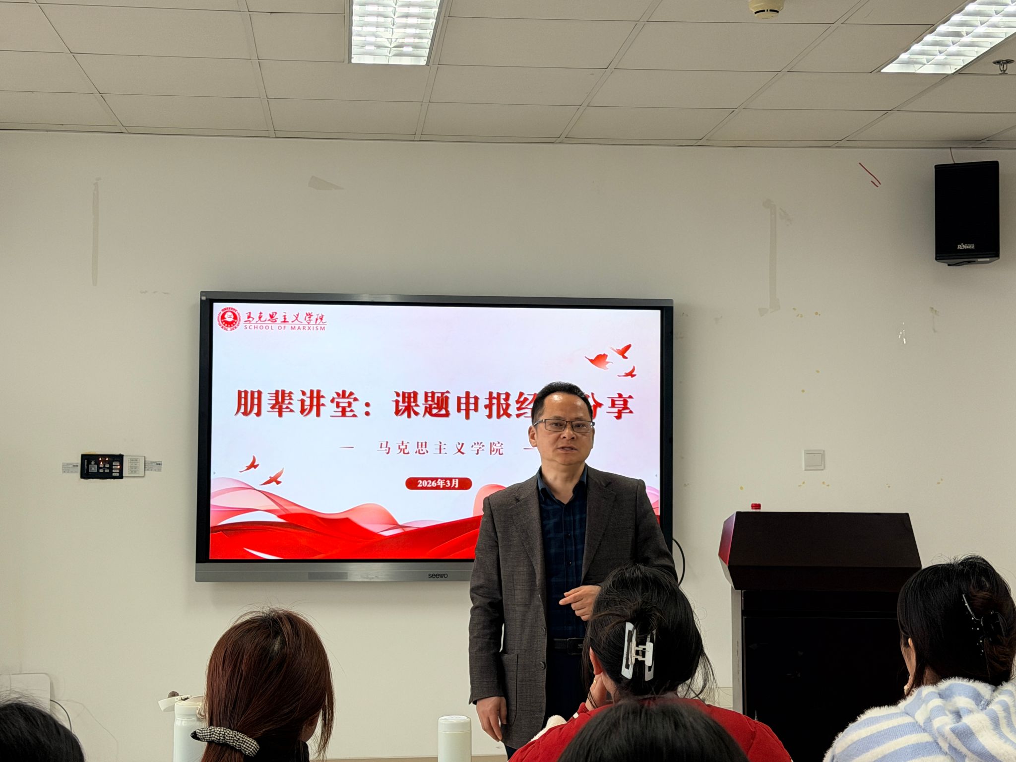 为进一步提升研究生科研素养,发挥优秀学子的朋辈引领作用,2026年3月25日下午,马克思主义学院在七教1605举办了一场课题申报经验分享会。本次活动由研究生教学部副主任冯义强精心组织,面向2025级全体研究生,通过“身边人讲身边事”的形式,帮助同学们明晰申报路径、掌握核心技巧。学院党委书记颜怀坤出席活动并致辞,充分体现了学院对研究生科研能力培养的高度重视。