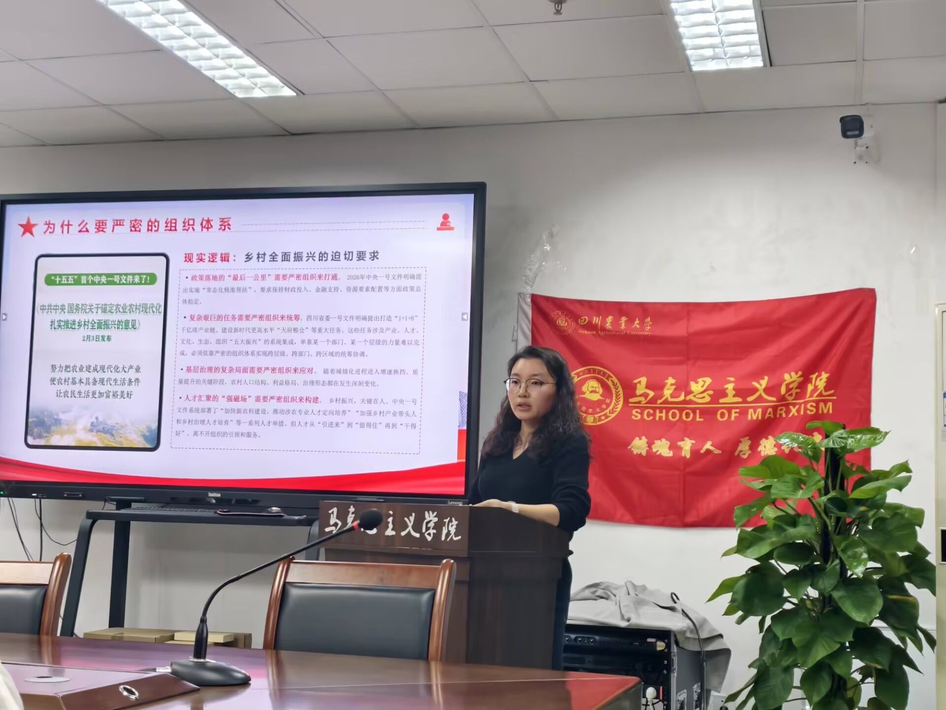4月2日,中国高等教育学会马克思主义研究分会2025年度“马克思主义经典著作研读”资助计划--四川农业大学《习近平关于全面从严治党论述摘编》读书小组举办第6次线下读书活动。本次活动以“坚持严密党的组织体系——学习贯彻2026年中央一号文件、四川省委一号文件”为主题,马克思主义学院张旭老师到场指导,读书小组全体成员及学院2025级研究生参与活动,读书小组成员丁逸尘主持活动。