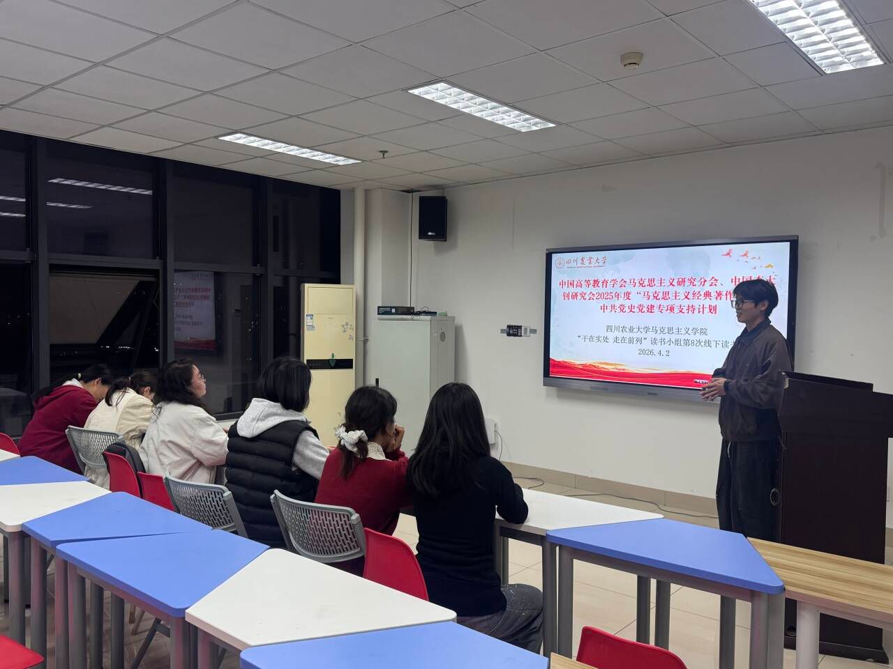 2026年4月2日,中国高等教育学会马克思主义研究分会、中国李大钊研究会2025年度“马克思主义经典著作研读”中共党史党建专项支持计划——四川农业大学“干在实处,走在前列”读书小组全体成员在七教1605举行第八次线下读书分享活动。本次活动聚焦习近平总书记《干在实处,走在前列——推进浙江新发展的思考与实践》第三章“加快建设文化大省”相关内容,围绕“以文化人、以文兴业,探索新时代文化振兴的基层路径”主题展开深入交流。