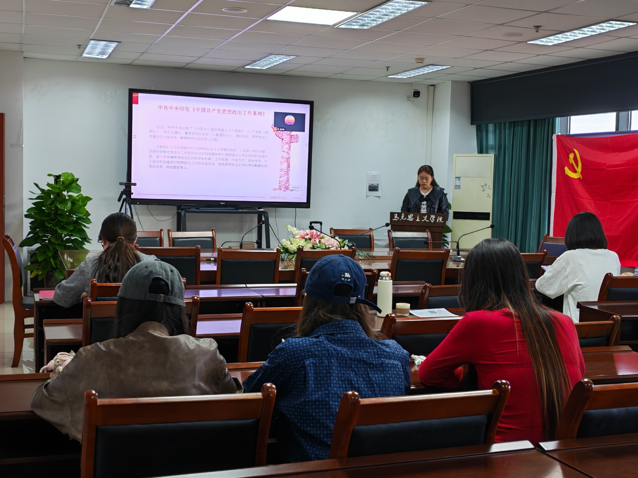 为全面落实党中央关于思想政治工作的战略部署,深刻把握《中国共产党思想政治工作条例》(以下简称《条例》)的核心要义与实践要求,进一步强化支部党员的思想政治素养和责任担当,10月13日下午,马克思主义学院研究生第二党支部在七教1607会议室顺利召开“学习《中国共产党思想政治工作条例》——新时代思想政治工作的重要制度保障”专题组织生活。会议由刘钦燕同志主持,支部全体党员参加。