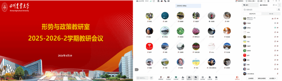 为进一步提升“形势与政策”课程教学质量,明确新学期教学任务与课堂管理要求,2026年4月10日晚上7点,马克思主义学院形势与政策教研室通过腾讯会议平台召开线上教研会议。会议由教研室主任邝良锋老师主持,邱高会副院长出席会议,全体形势与政策课教师参加。