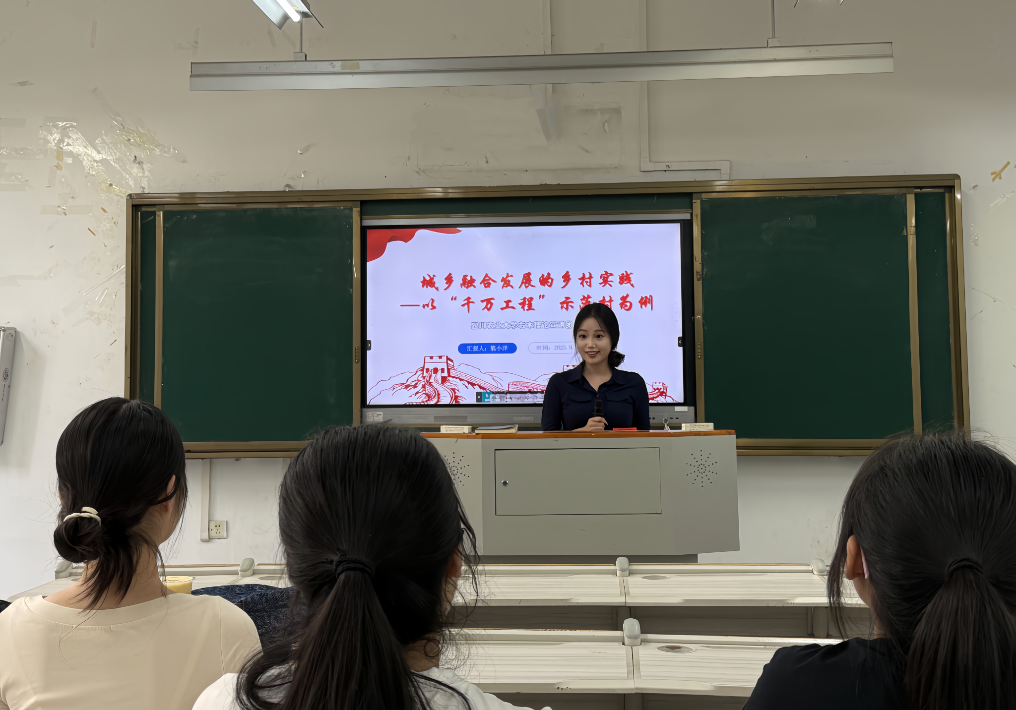本次宣讲以“城乡融合发展的乡村实践——以‘千万工程’示范村为例”为题。熊小洋同学系统梳理了国家关于城乡融合发展的战略部署与重大意义,重点介绍了浙江省“千村示范、万村整治”工程的起源背景、发展历程及其在改善农村人居环境、促进乡村产业兴旺、推动基层有效治理等方面取得的辉煌成就。通过剖析金华武义县坛头村、杭州萧山区梅林村、湖州南浔区旧馆街道等不同特色的实践案例,生动展现了“千万工程”如何深刻改变乡村面貌,并总结了其“四位一体”的宝贵治理经验。最后,宣讲结合党的二十届三中全会精神,对未来进一步推动城乡融合发展进行了展望。