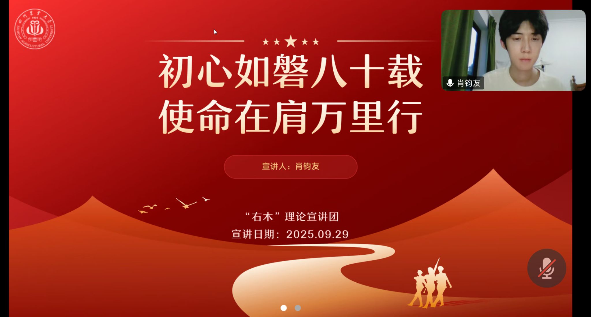 2025年9月29日晚7时,右木理论宣讲团成员肖钧友应动物科技学院研究生第三党支部邀请,通过线上方式为该支部组织生活会作题为“初心如磐八十载,使命在肩万里行”的主题宣讲。