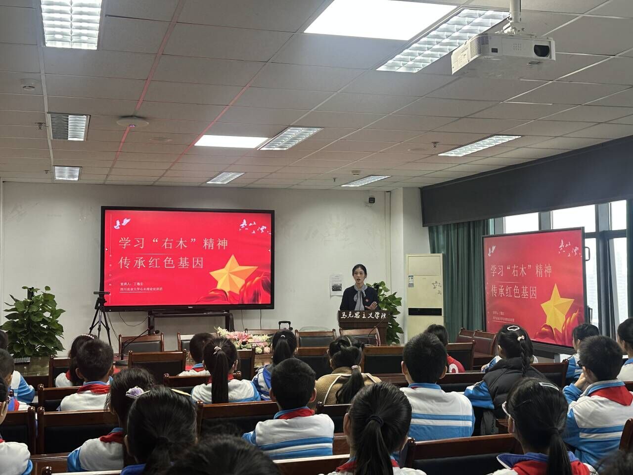 11月5日上午,在四川农业大学马克思主义学院1607教室,右木理论宣讲团面向温江区公平学校的学生,开展了一场题为《学右木精神,传红色基因》的红色主题宣讲活动。本次活动旨在深入推进红色文化融入校园,让革命精神在青少年心中生根发芽。活动以生动讲述、情景带入、互动交流等方式,引领孩子们走近革命先驱王右木的光辉一生,在童心中播撒理想信念的种子。