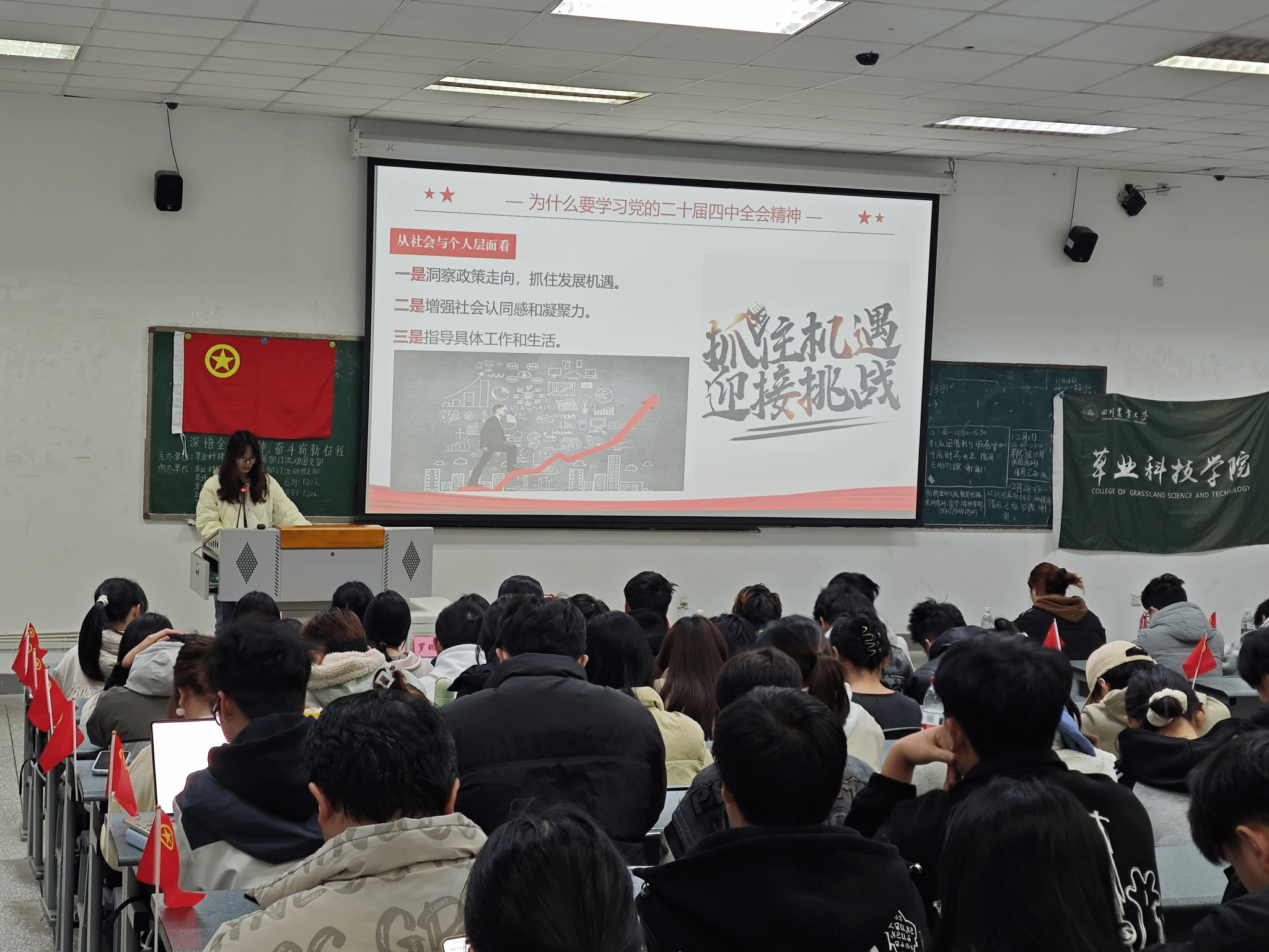 为深入学习贯彻党的二十届四中全会精神,推动党的创新理论在青年学生中落地生根,12月2日下午,四川农业大学右木理论宣讲团成员刘静走进草业科技学院示范性班团活动,面向草坪202501班、草学202401班、草坪202401班等6个团支部,开展了以“认识党的二十届四中全会,学习贯彻全会精神”为主题的理论宣讲。
