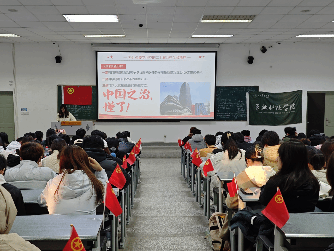 宣讲会上,刘静围绕“为什么要学习党的二十届四中全会精神”“我国的重要会议制度”“党的二十届四中全会核心内容”三个方面展开系统阐述,结合生动案例与时政热点,为同学们进行了细致解读。她重点阐述了坚持把解决好“三农”问题作为全党工作重中之重的重要意义,并联系草业学科特色,引导同学们深刻理解全面深化改革在推进中国式现代化进程中的关键作用。