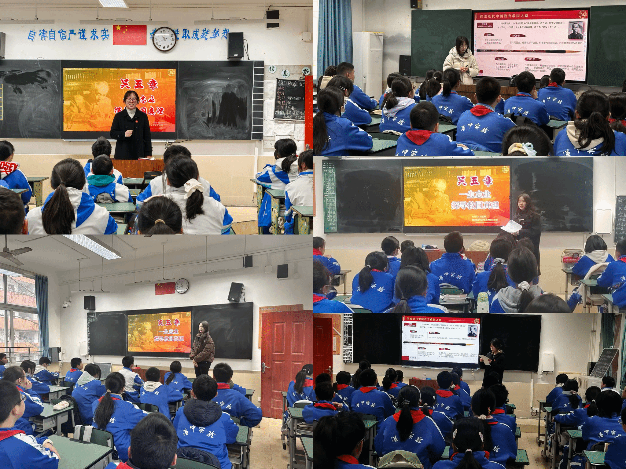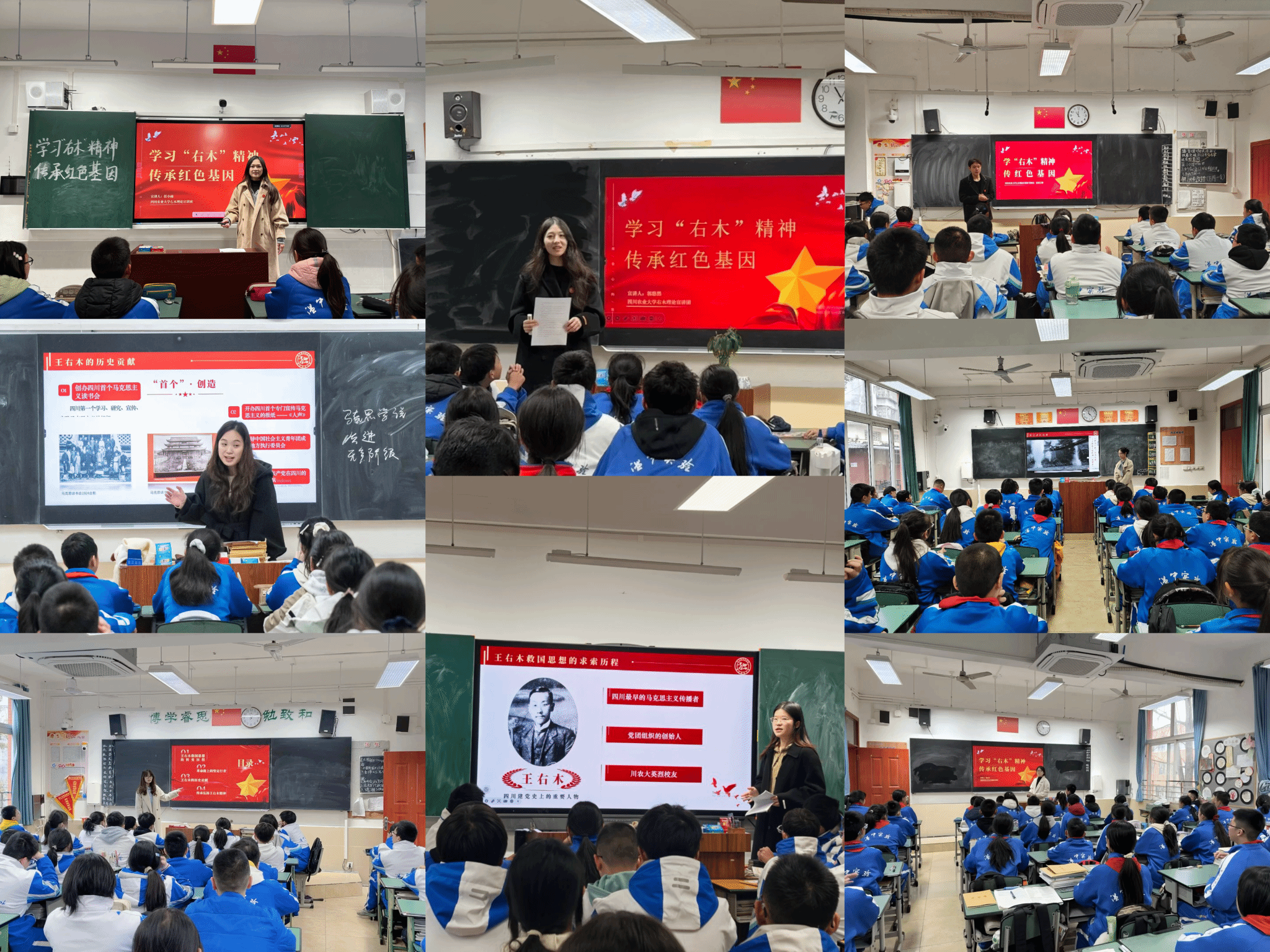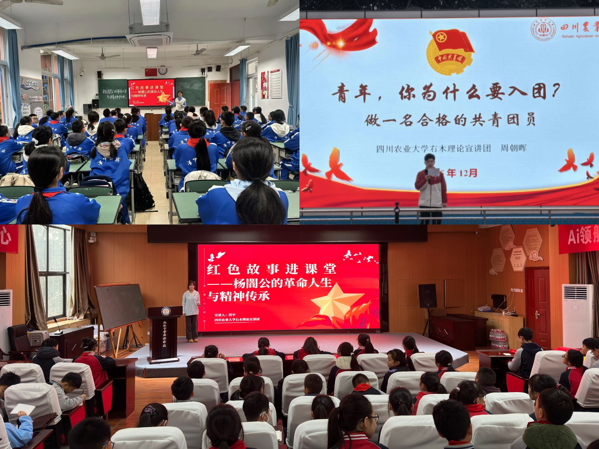 为了进一步传承红色基因、弘扬革命先辈崇高精神,推动大中小学思政课一体化建设。2025年12月8日,四川农业大学右木理论宣讲团的39位讲师走进温江中学实验学校,在周朝晖讲师为全校师生带来一堂生动的主题团课后,讲师们前往不同的年级、教室,为温江中学实验学校及温江区东大街第二小学的学生们开启了一场“红色故事进课堂”主题宣讲。讲师们围绕杨闇公、张闻天、刘伯承、王右木、吴玉章五位革命先辈的事迹,用生动的故事讲解方式,让红色基因在青少年心中落地生根。
