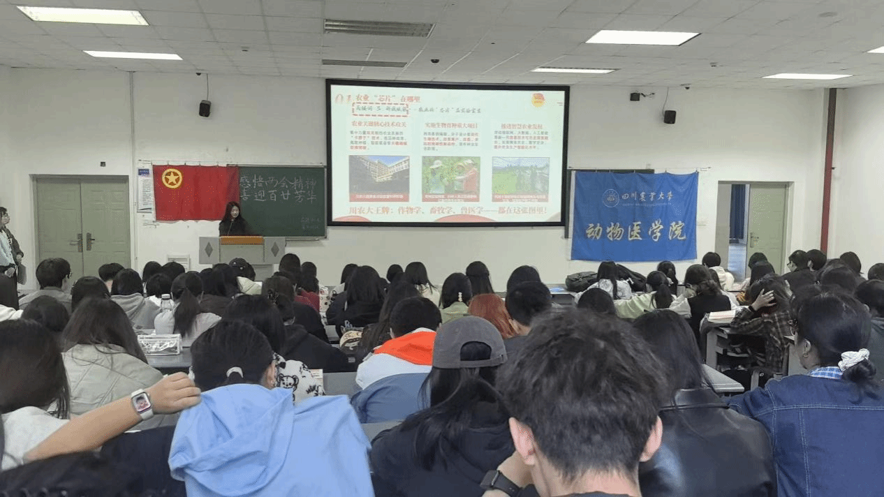 2026年3月31日,右木理论宣讲团成员孙雅璇走进四川农业大学动物医学院六个支部联合班团活动现场,以《田野上的答案——川农青年这样读一号文件》为题开展主题宣讲,带领在场学生一同学习中央一号文件,带领在场学子深入学习领会中央一号文件精神,共话新时代川农青年的使命担当。